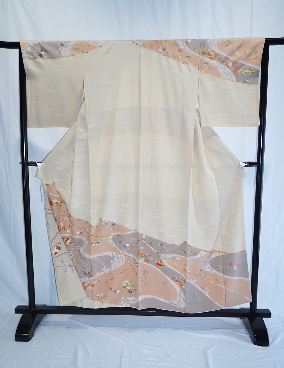 ベージュ地 花源氏車柄 汕頭刺繍訪問着